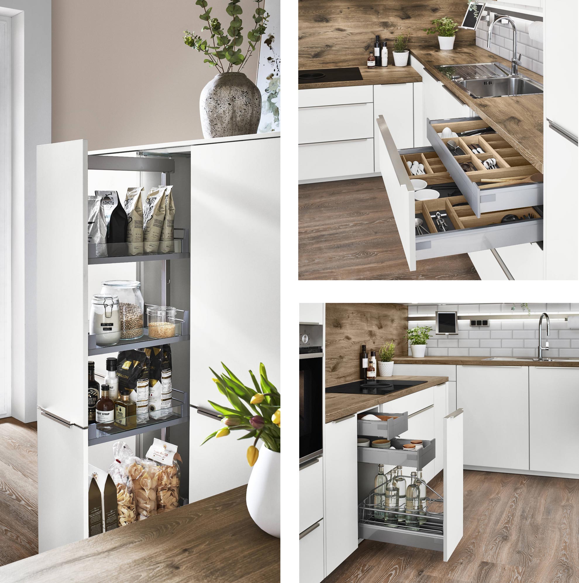 Verwandeln Sie Ihre L-Küche in ein Stauraumwunder und genießen Sie den perfekten Mix aus Funktionalität und Design. Innovative Ecklösungen wie Karussell- oder Le-Mans-Schränke nutzen den Raum optimal aus.