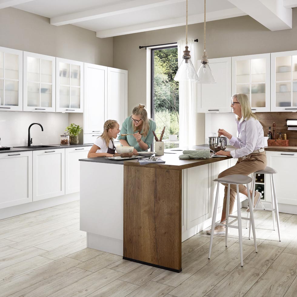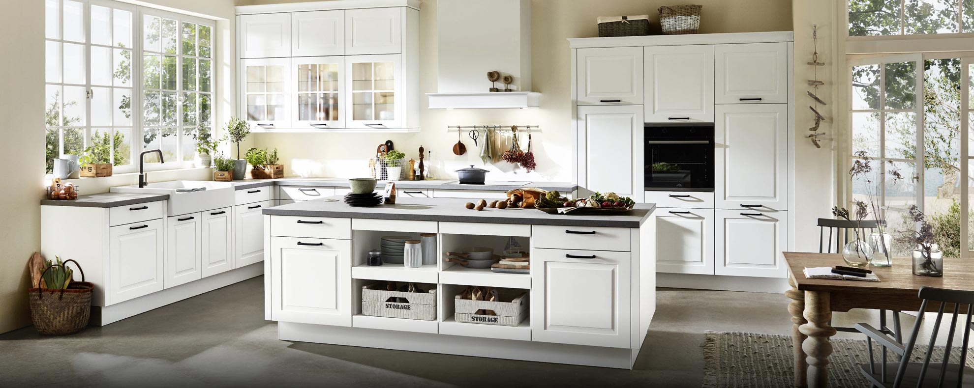Charakteristisch für eine Küche im Landhausstil sind natürliche Materialien wie Holz und Stein. Auch rustikale Einrichtungselemente wie dekorative Weidenkörbe, Spülsteine und massive Holzelemente sowie charakteristische Details wie Kassettenfronten und nostalgische Knopfgriffe verbreiten den Charme der wohnlichen Landhausküche. Klassische Farben wie Weiß, Creme oder Hellbraun geben der Landhausküche ein harmonisches Flair und lassen sie groß und einladend erscheinen.