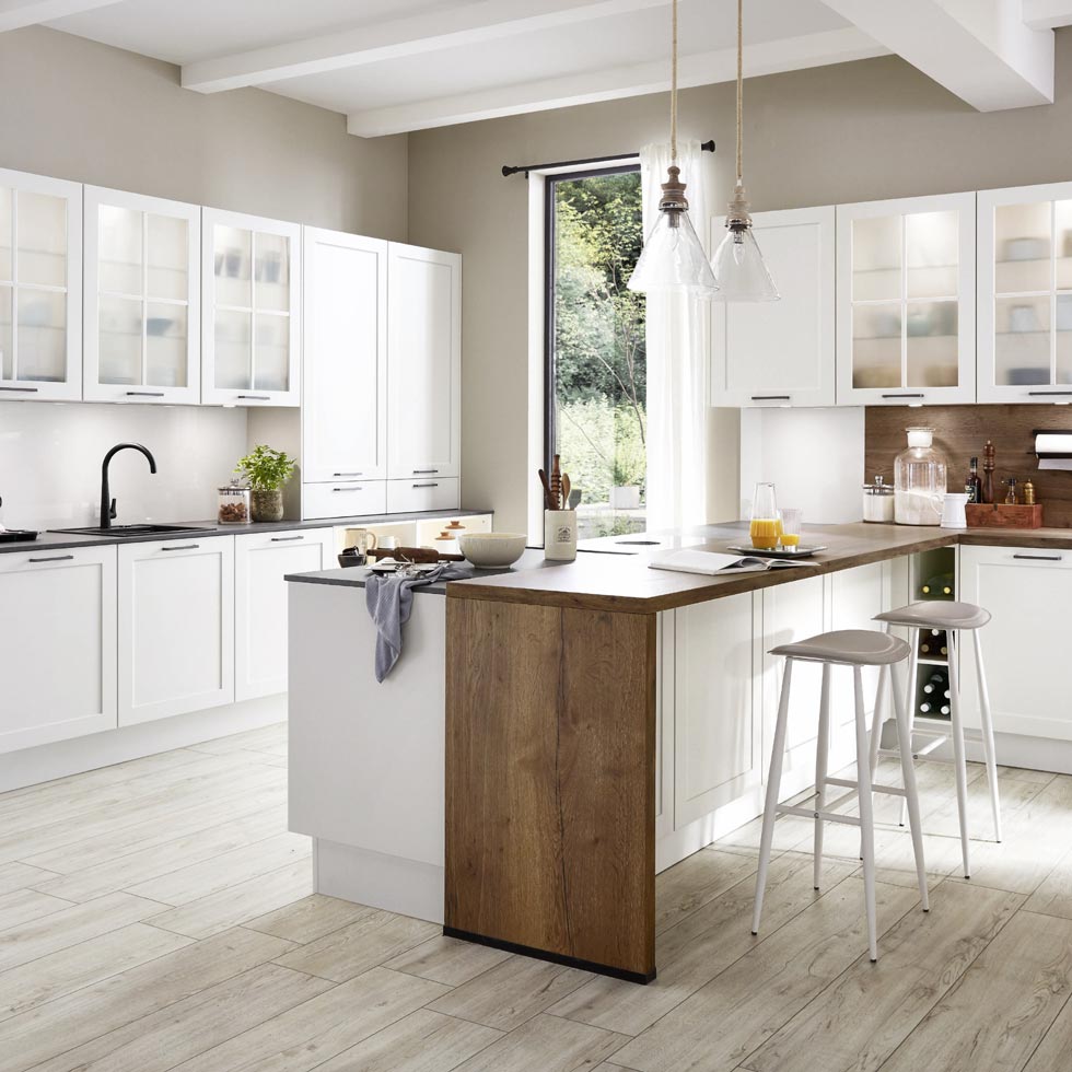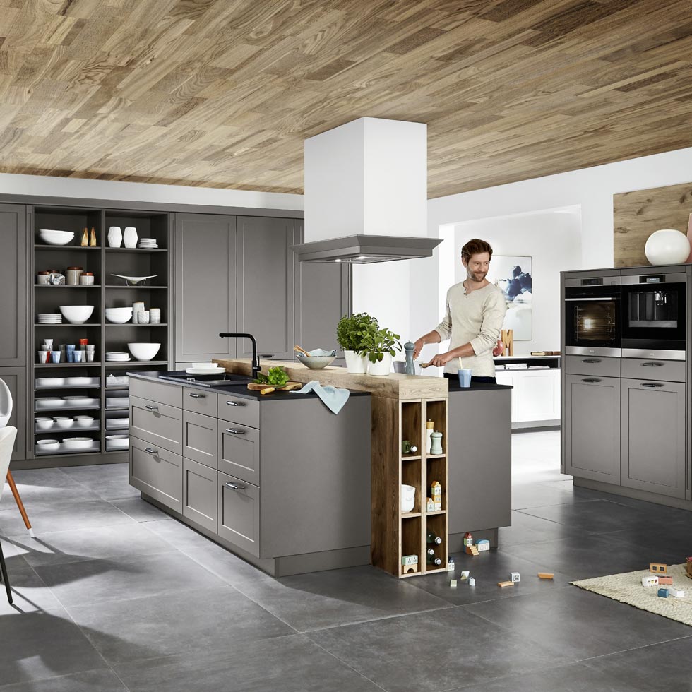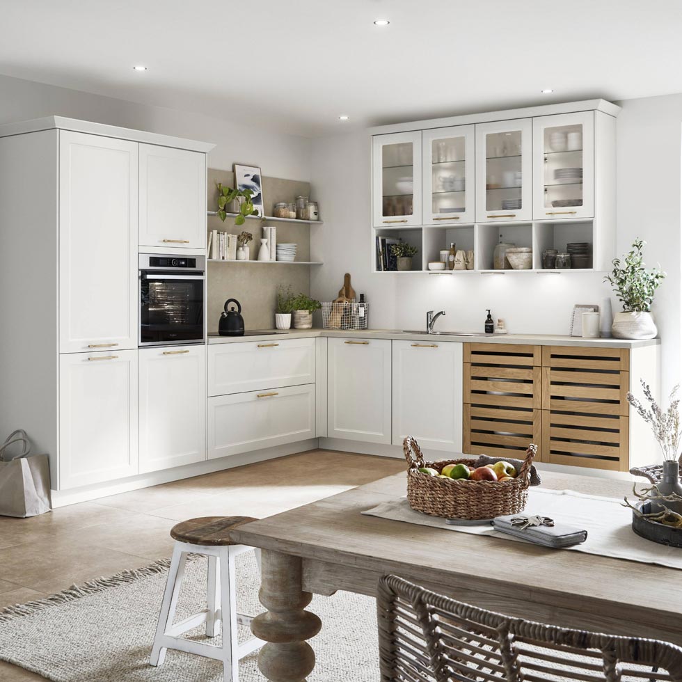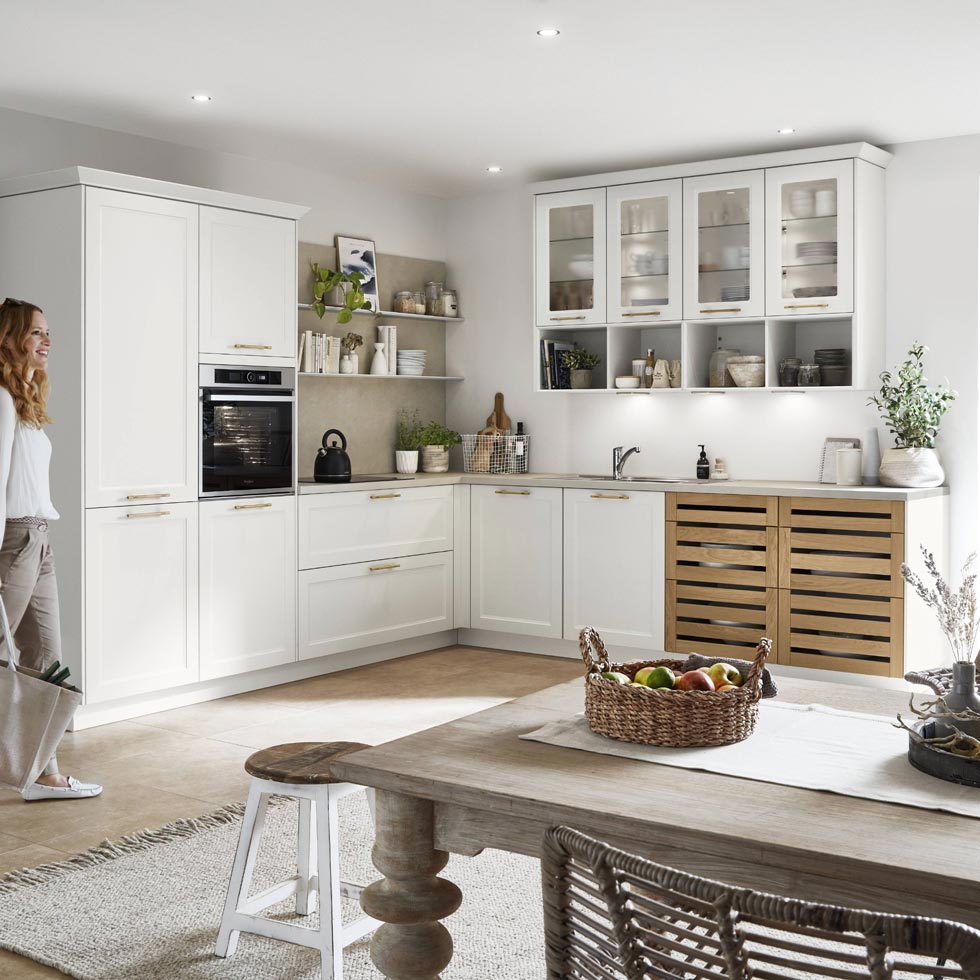 Griffe aus Holz und Auszüge mit Fronten aus Massivholz verleihen dieser Küche einen wohnlichen Charme.