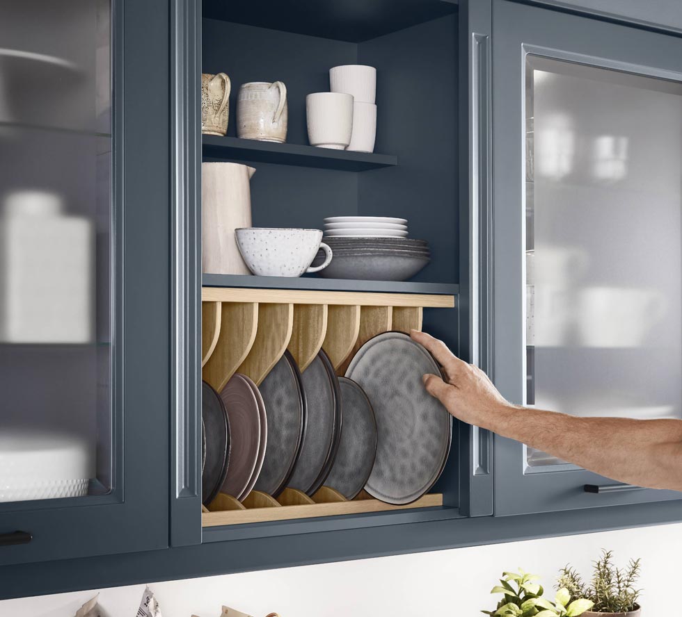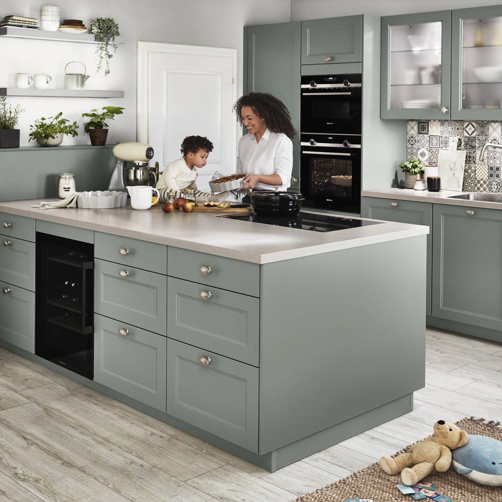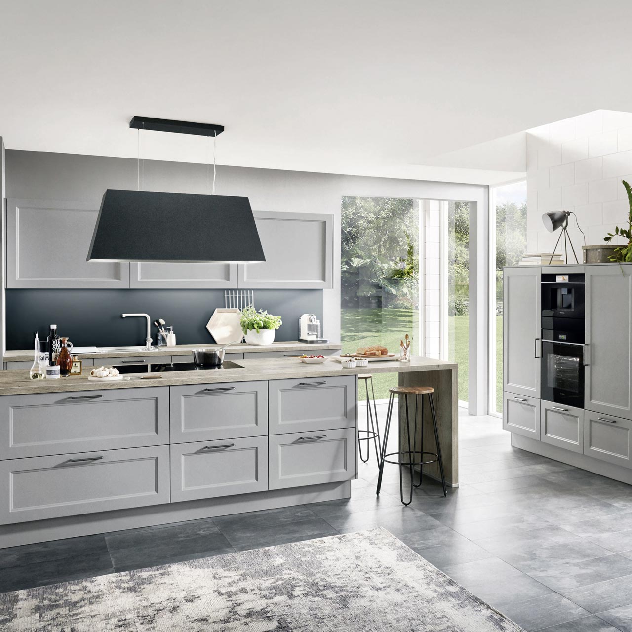 Griffe aus Holz und Auszüge mit Fronten aus Massivholz verleihen dieser Küche einen wohnlichen Charme.