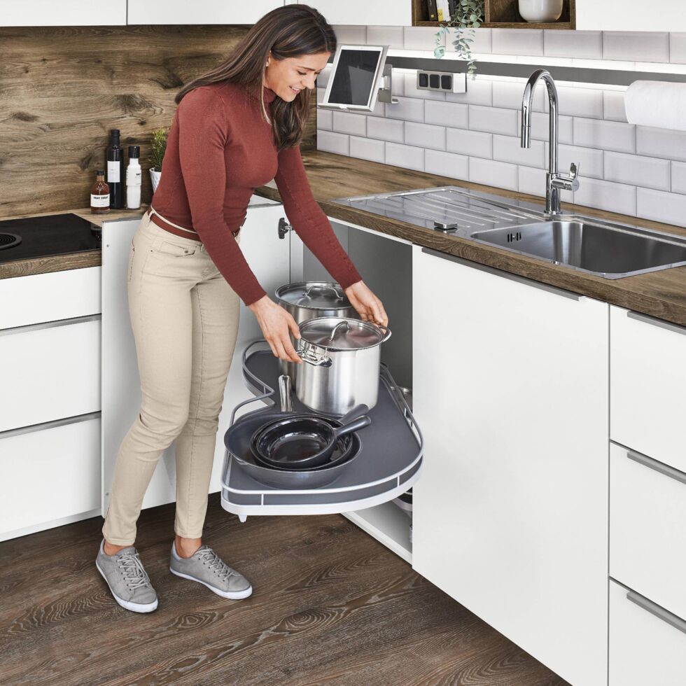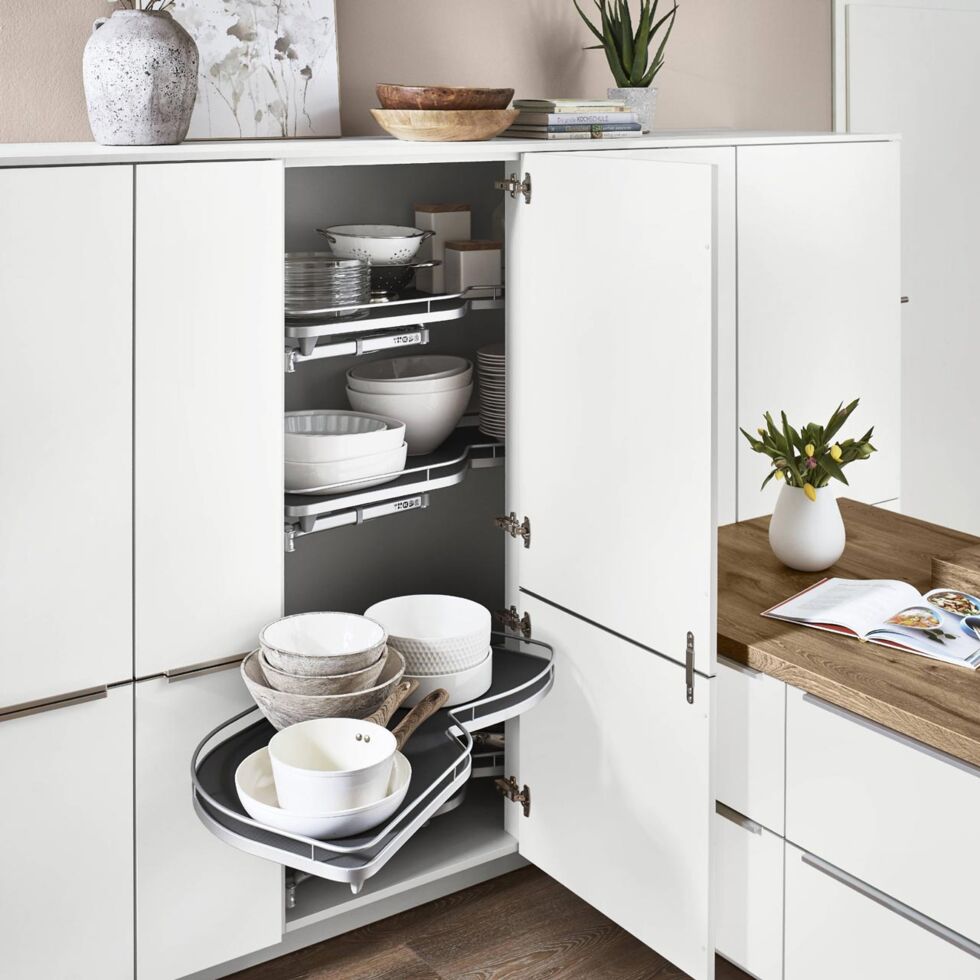 Verwandeln Sie Ihre L-Küche in ein Stauraumwunder und genießen Sie den perfekten Mix aus Funktionalität und Design. Innovative Ecklösungen wie Karussell- oder Le-Mans-Schränke nutzen den Raum optimal aus.